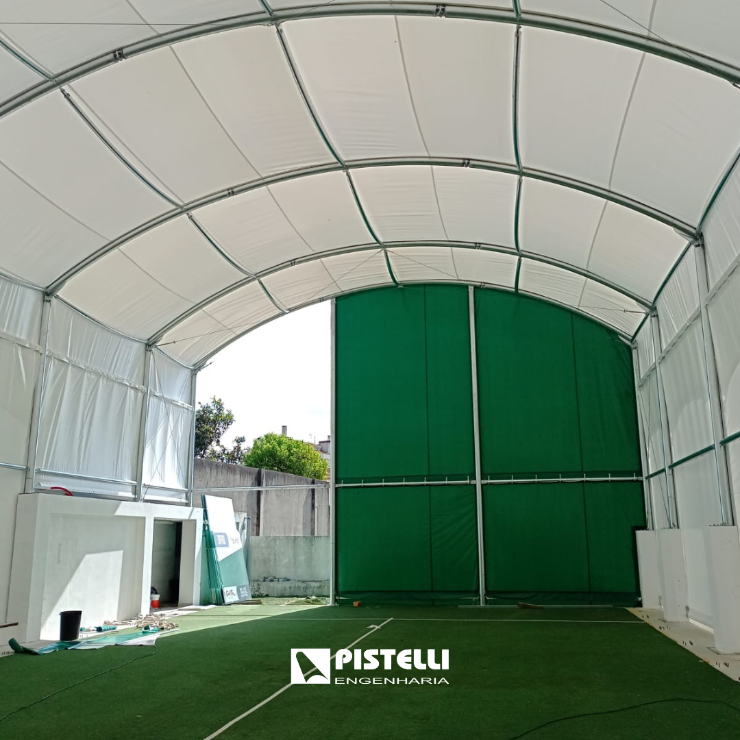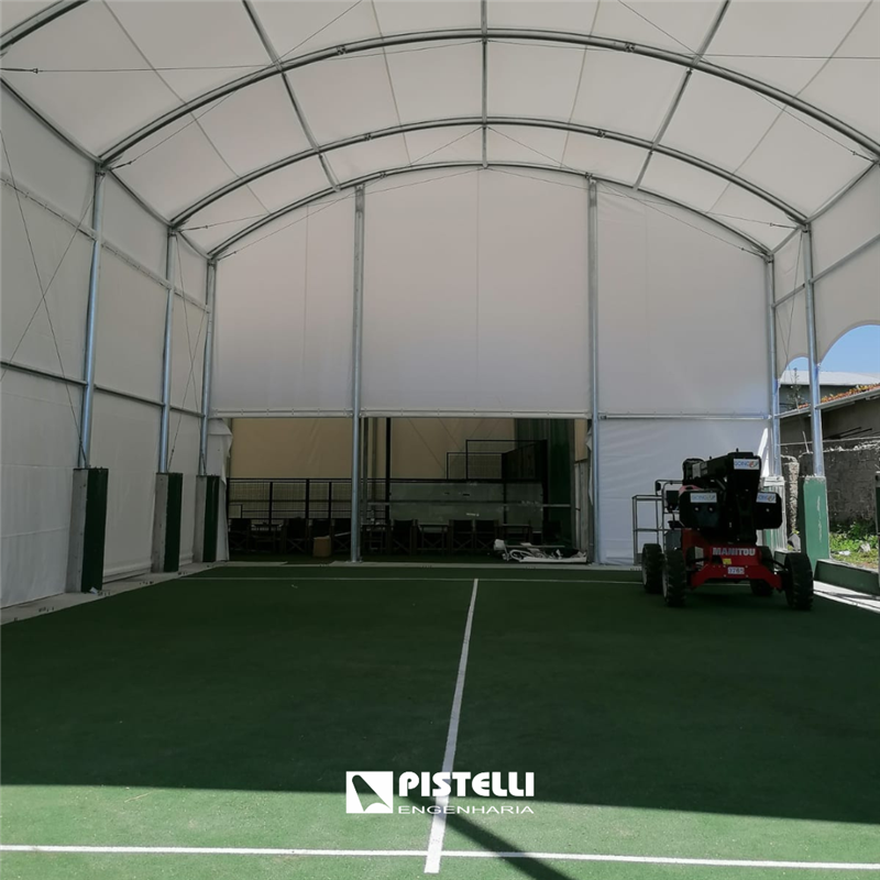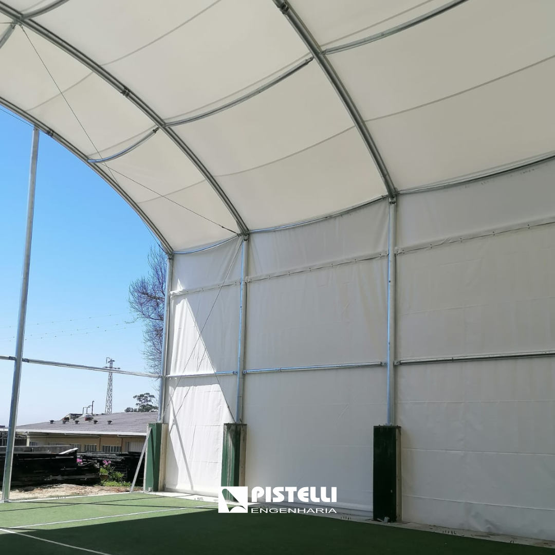 A estrutura, projectada para oferecer ampla área de protecção, combina robustez, estabilidade e design funcional, permitindo a prática desportiva mesmo em dias de chuva ou forte exposição solar. A geometria poligonal confere maior resistência aos ventos e optimiza a distribuição da luz natural, criando um ambiente confortável para atletas e público.
